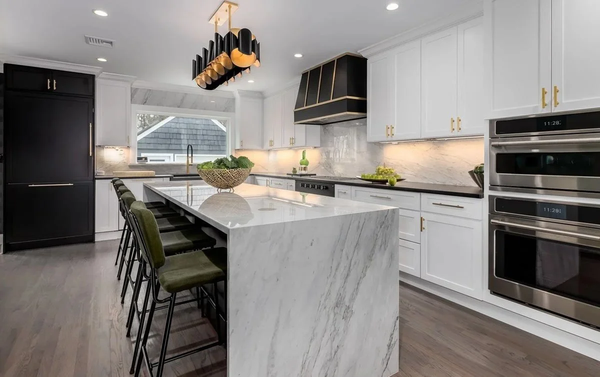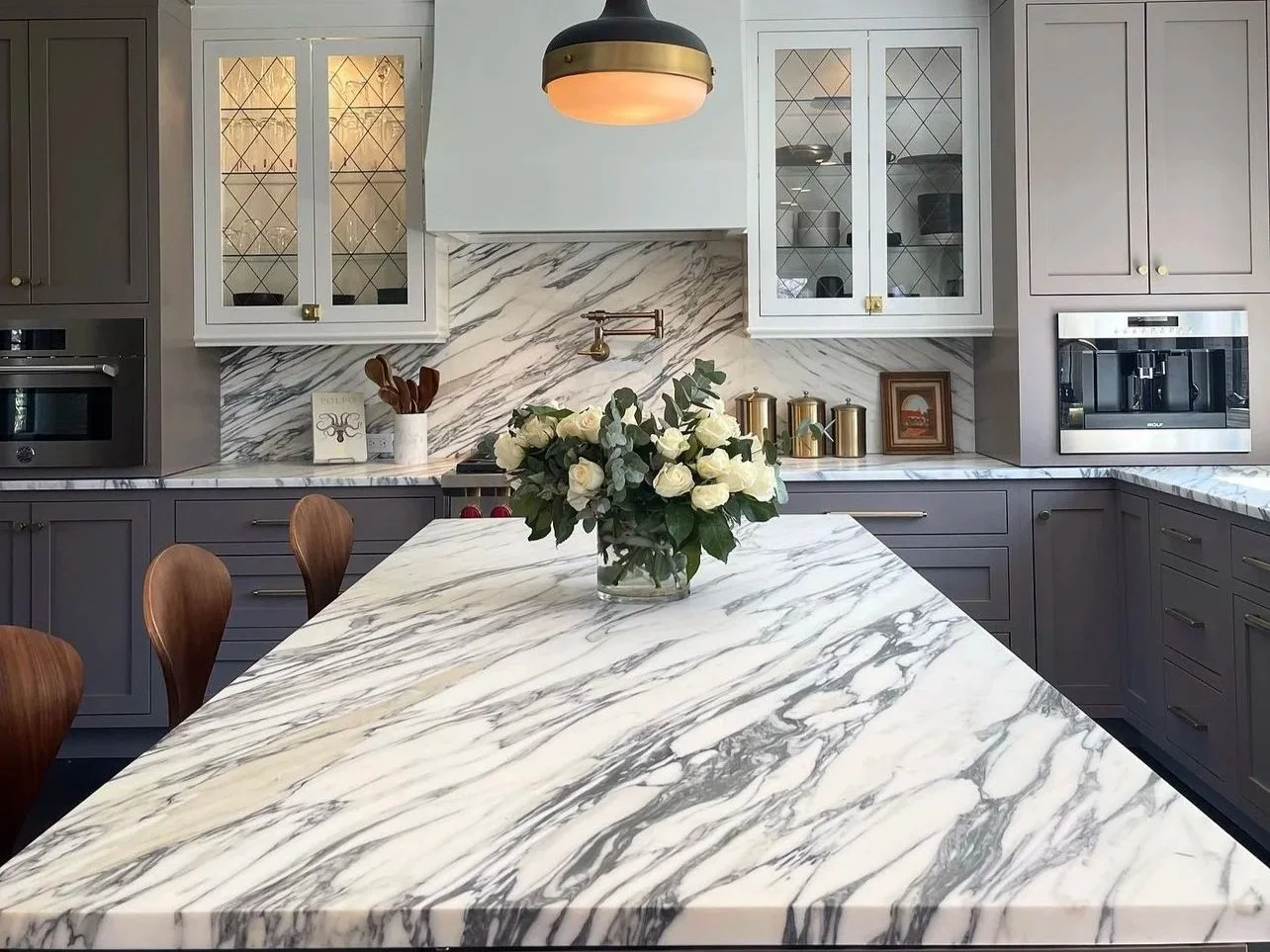 Custom marble island and backsplash fabricated and installed as part of a residential kitchen renovation.